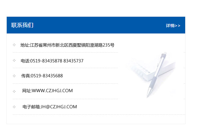 地址:常州市新北區友邦商務大廈1幢16、17層  電話:0519-85101652  傳真:0519-85112595  郵編:213022  網址:www.cz-jiayue_cn.blkssb.com  郵箱:xiajifengaa@163.com